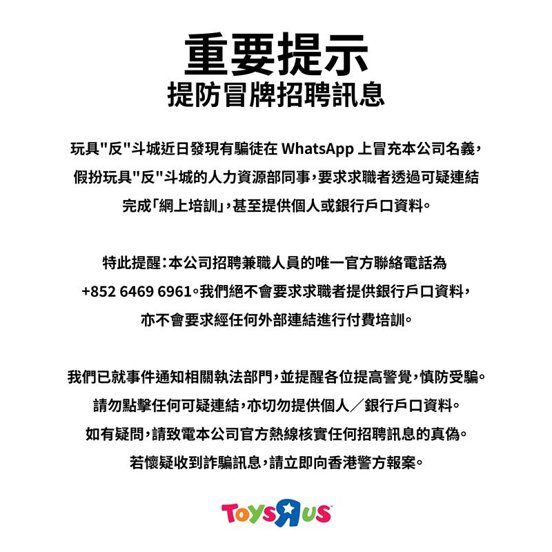 如未能親臨分店應徵,請將履歷表 (需註明申請職位、可工作地區及可工作時間) 電郵至 career.hkg@toysrusasia.com 或 Whatsapp 6469 6961